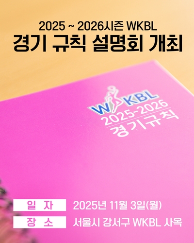 (서울=연합뉴스) 설하은 기자 = 한국여자농구연맹(WKBL)은 11월 3일 오후 3시 서울 강서구 WKBL 사옥 1층 라운지에서 2025-2026시즌 WKBL 경기 규칙 설명회를 개최한다고 23일 밝혔다.