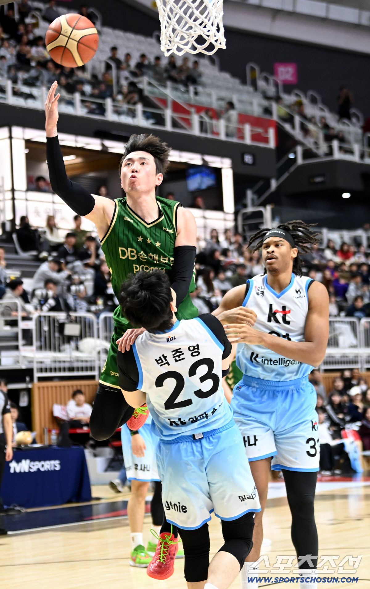 19일 수원KT소닉붐아레나에서 열린 프로농구 수원 KT와 원주 DB의 경기. DB 강상재가 KT 박준영의 수비를 피해 레이업을 시도하고 있다. 수원=허상욱 기자wook@sportschosun.com