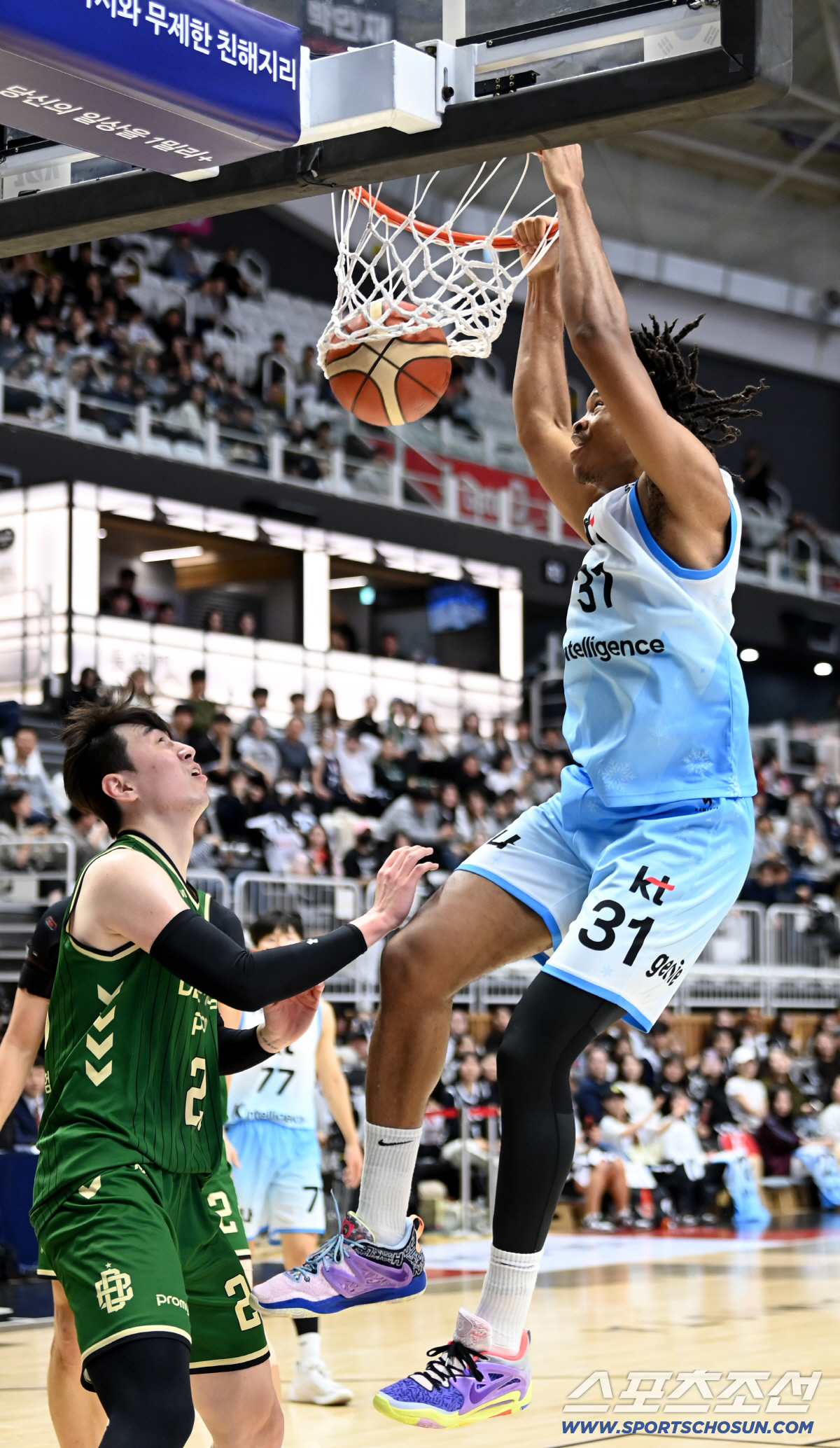 19일 수원KT소닉붐아레나에서 열린 프로농구 수원 KT와 원주 DB의 경기. KT 힉스가 DB 강상재의 수비를 피해 덩크를 시도하고 있다. 수원=허상욱 기자wook@sportschosun.com