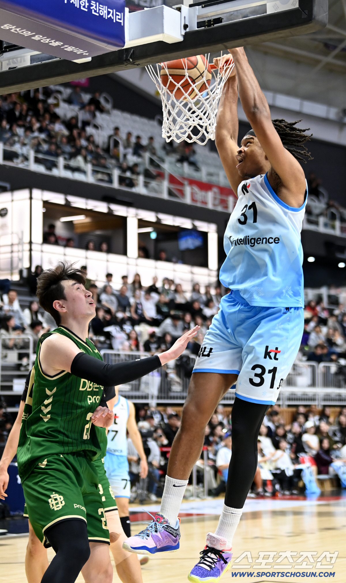 19일 수원KT소닉붐아레나에서 열린 프로농구 수원 KT와 원주 DB의 경기. KT 힉스가 DB 강상재의 수비를 피해 덩크를 시도하고 있다. 수원=허상욱 기자wook@sportschosun.com