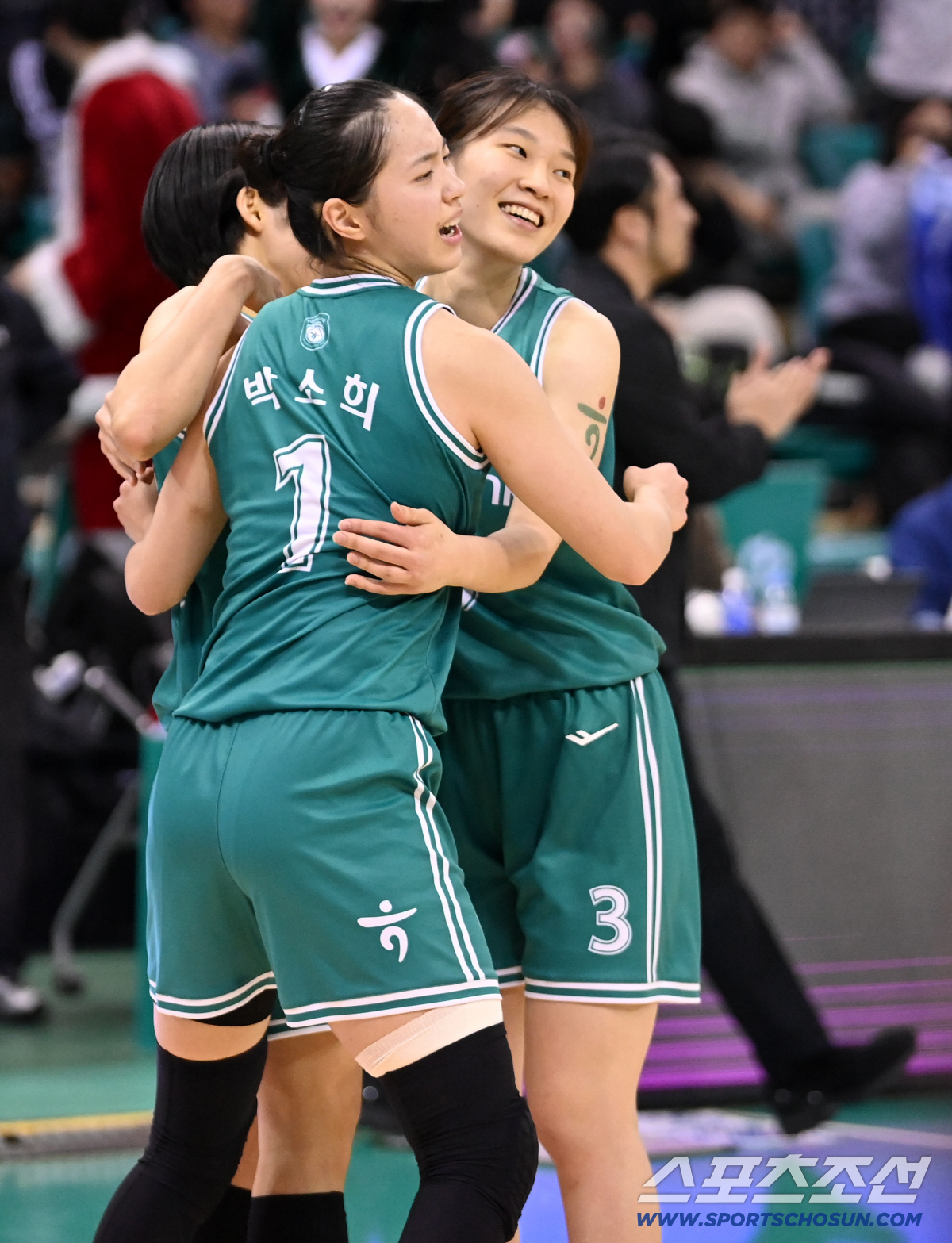26일 부천체육관에서 열린 여자프로농구 하나은행과 신한은행의 경기. 신한은행이 64대62로 승리했다. 경기 종료 후 기쁨을 나누는 하나은행 박소희, 정현, 사키의 모습. 부천=허상욱 기자wook@sportschosun.com