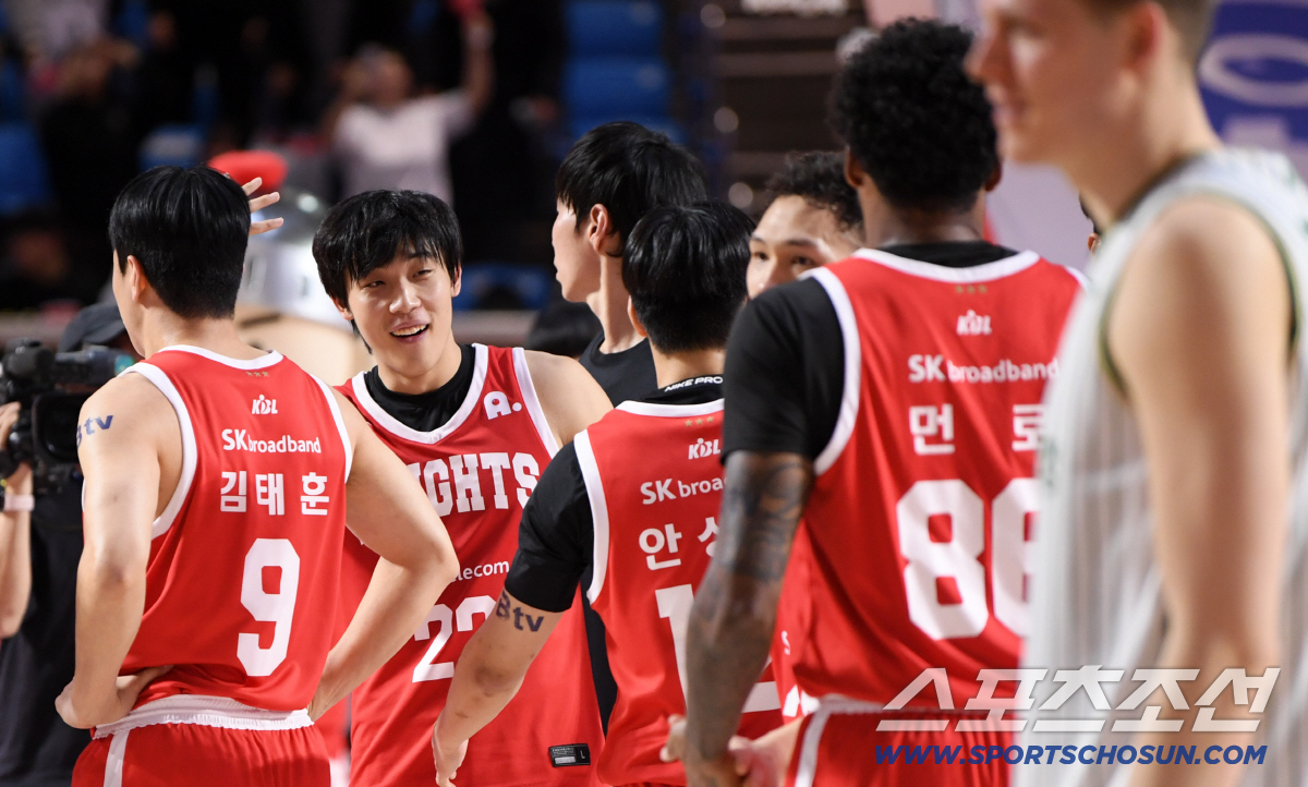 13일 잠실학생체육관에서 열린 프로농구 서울 SK와 원주 DB의 경기. 승리한 SK 선수들이 기뻐하고 있다. 잠실=박재만 기자 pjm@sportschosun.com/2026.01.13/