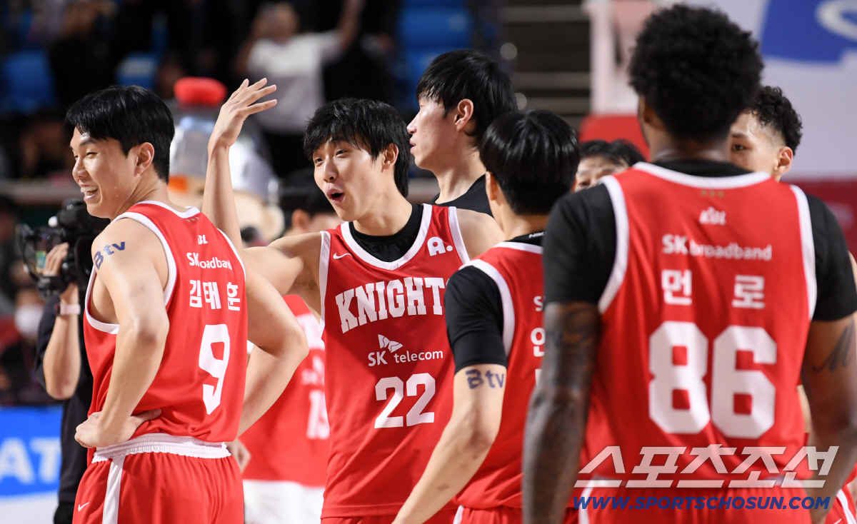 13일 잠실학생체육관에서 열린 프로농구 서울 SK와 원주 DB의 경기. 승리한 SK 선수들이 기뻐하고 있다. 잠실=박재만 기자 pjm@sportschosun.com/2026.01.13/
