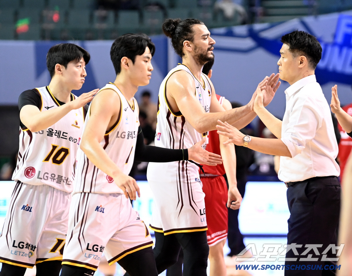 5일 잠실실내체육관에서 열린 프로농구 서울 삼성과 창원 LG의 경기. LG 마레이, 유기상, 윤원상이 조상현 감독과 하이파이브를 하고 있다. 잠실실내체=허상욱 기자wook@sportschosun.com