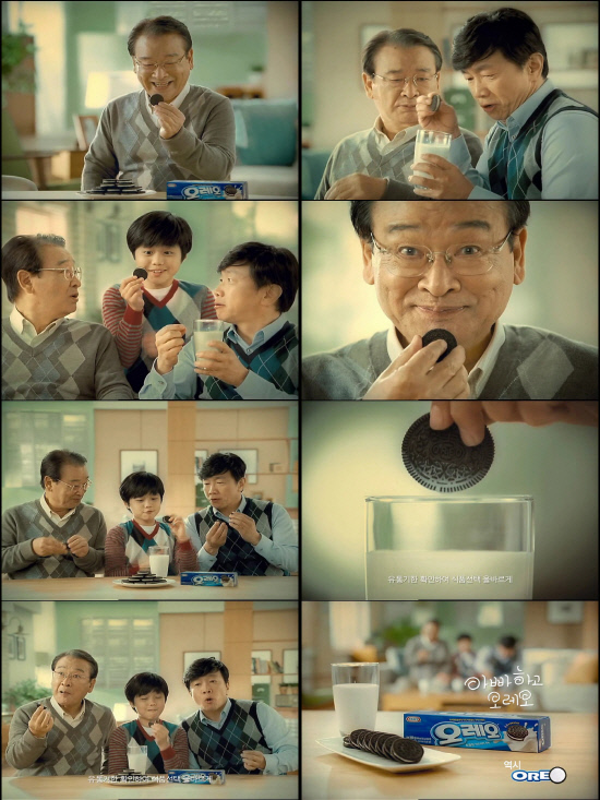 동서식품 오레오에서 새롭게 선보인 광고 '삼대 편'은 거실을 지나치다 우연히 오레오 쿠키를 발견한 할아버지 이순재로부터 시작한다. 먹음직스러운 오레오를 보고 이순재가 손을 뻗는 순간, 아빠 박철민이 등장해 오레오를 맛있게 먹는 방법을 설명한다. 다시 박철민이 오레오를 먹으려는 순간, 이번에는 아들 임제노가 나타나 오레오를 더욱 맛있게 먹는 방법을 설명해준다. 할아버지는 아빠에게, 아빠는 아들에게 오레오를 먹는 완벽한 방법을 배우고 난 후 삼대가 하나가 되는 훈훈한 장면으로 광고는 끝을 맺는다.