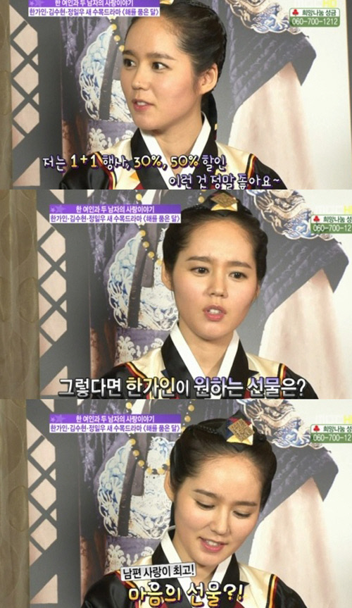 하지만 리포터가 "지금처럼 통금 시간 12시만 지켜주면 되냐"고 재질문하자 한가인은 "그렇다. 지금처럼 통금시간만 지켜주면 된다"고 수줍게 대답했다.