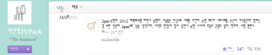 박진영은 3일 자신의 개인 블로그 미투데이에 "2PM 6명과 2012 계획 회의를 하면서 놀랐다. 이놈들은 진심으로 서로를 아낀다. 6명 모두가 서로서로를"이라며 "5년차 가수들인데 말하는걸 보면 영원히 2PM으로 남을 생각이다. 아직도 한 집에 같이 살면서 6명 사이에 조금의 균열도 없다. 멋지다. 이팀 롱런이다"고 밝혔다.