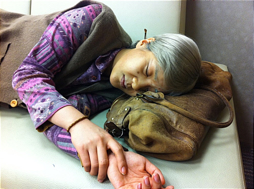 사진을 본 네티즌들은 "웬지 자는 모습이 짠하다", "많이 피곤한가봐요", "뭔가 웃기면서도 슬픈 사진", "분장 진짜 잘하셨네요", "얼짱할매니까 괜찮아요! 힘내세요"등의 반응을 보였다.