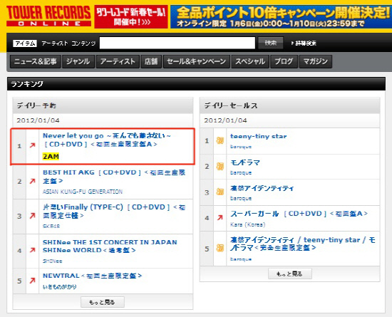 2AM의 일본 데뷔 싱글이 선주문 차트 1위를 차지했다.