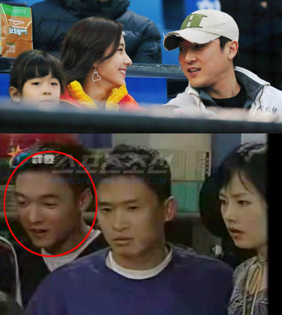 지난해 야구장을 찾았다 본지에 포착된 한채영 부부. 아래는 남편 최동준씨가 서경석, 김선아 등과 함께 1999년 시트콤에 출연했을 때의 모습. <조병관 기자 rainmaker@sportschosun.com, 동영상 캡처>