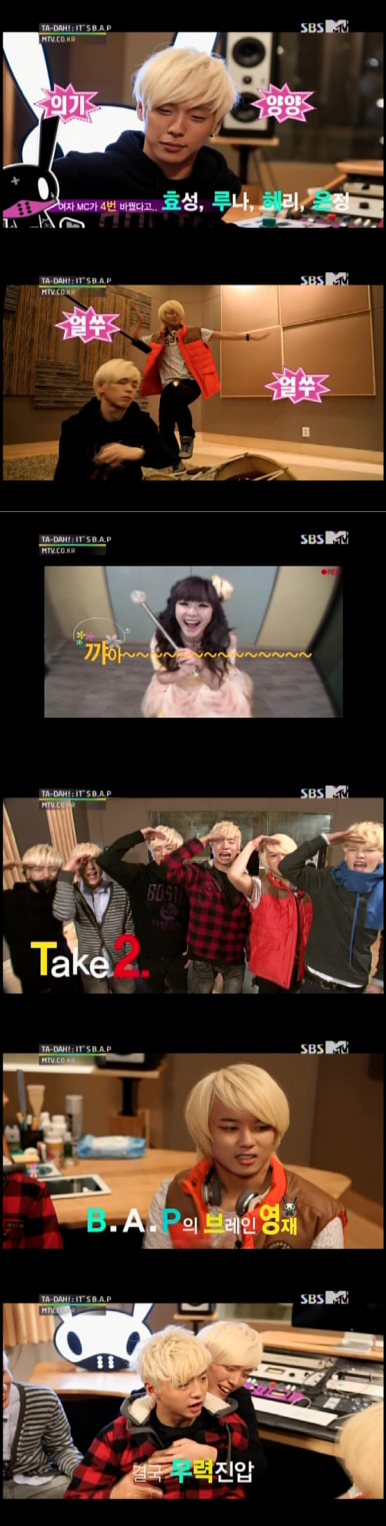 8일 SBS-MTV를 통해 방송된 '타다, 잇츠 B.A.P'는 기존의 리얼리티 프로그램 포맷과 달리 지구 정복을 위해 아이돌 그룹이 되기로 결심한 6명의 외계인들의 지구 적응기를 다루는 특이한 컨셉트로 초반부터 시선을 사로잡았다. 이날 방송에서는 지난해 말레이시아에서 펼쳐진 'MTV 월드 스테이지' 방문기와 개개인의 솔로 및 유닛 활동을 조명했다. '국악고 얼짱' 출신인 힘찬은 장구 실력을 유감없이 발휘했고, 15세 미소년 젤로 역시 존재감을 입증했다. MBC '우리들의 일밤-룰루랄라'에 고정 출연중인 방용국은 곱상한 외모와는 달리 숨겨진 욕설 실력(?)을 드러내 예능감을 뽐냈다.