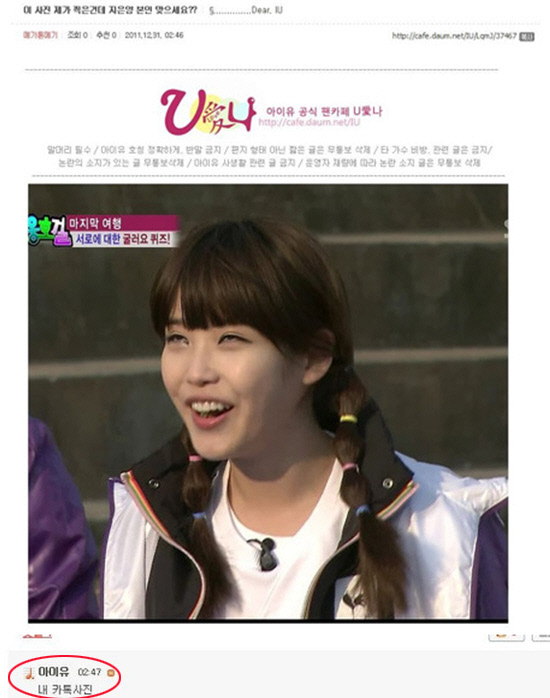해당 게시글은 아이유 공식 팬카페에 한 팬이 "이 사진 제가 찍은 건데 지은양 본인 맞으세요?"라며 과거 아이유가 출연했던 SBS '영웅호걸'에서 방송 모습을 캡처해 올린 사진이다.