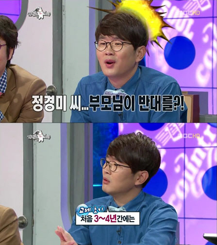 11일 방송된 MBC '황금어장-라디오스타'에서 MC들은 윤형빈에게 "결혼이 늦어지는게 정경미 부모가 반대해서 그렇다는 말이 있다"며 "개그맨인데 안 웃겨서 집에서 반대한다고"라고 덧붙이며 물었다.