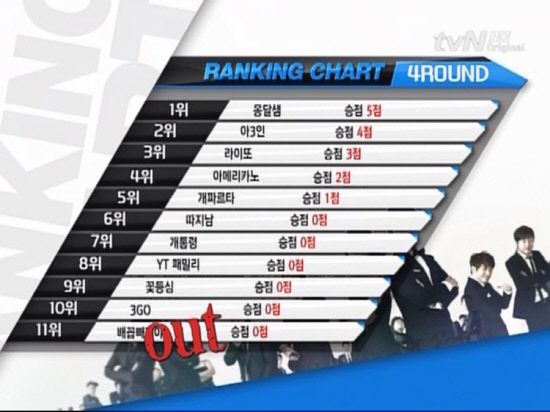 한편, 지난 3라운드에서 무관의 한을 풀고 처음으로 1위를 차지하는 기쁨을 맛본 아3인(이상준, 예재형, 김기욱)은 경합 끝에 2위에 머물렀다. 아3인은 이번 시즌 공동경비구역(JSA)을 배경으로 한 관객참여 개그가 상승세를 타면서 강력한 우승후보로 주목 받고 있다. 옹달샘과 3, 4라운드의 왕좌를 각각 나눠가지며 장군멍군의 형국을 띄었기 때문에 돌아오는 5라운드 승부가 어떻게 진행될지 기대된다.