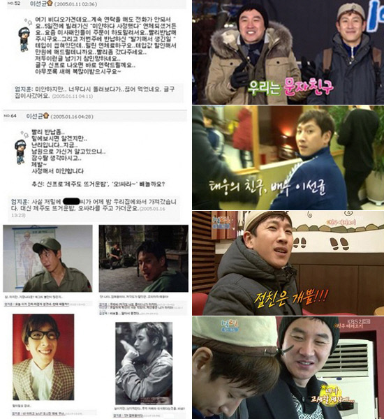 이선균은 엄태웅 미니홈피에 "여기 비디오 가게인데요, 계속 연락을 해도 전화가 안되서요. 5일전에 빌려가신 '미안하다 사정했다' 연체되셨거든요"라고 장난스러운 글을 남겼다. 이에 엄태웅은 "미안하지만 너무 다시 돌려보다가 끊어 먹었네요 글구 집 이사갔어요"라고 답해 웃음을 자아냈다. 이 미니홈피 내용은 무려 2005년에 주고 받은 대화 내용. "평소 문자, 미니홈피 댓글놀이로 점차 가까워졌다"는 두 사람이 최근 KBS2 '1박2일-절친특집'에 함께 출연하면서 다시 팬들의 관심을 받게된 것이다. 최소 7년전부터 쌓아온 두 사람의 두터운 우정이 엿보인다. 특히 엄태웅은 이선균을 소개하며 "문자친구"라고 했지만 곧 "그래도 친구 하면 이선균이 가장 먼저 떠오른다"고 말해 절친임을 입증했다. <스포츠조선닷컴>