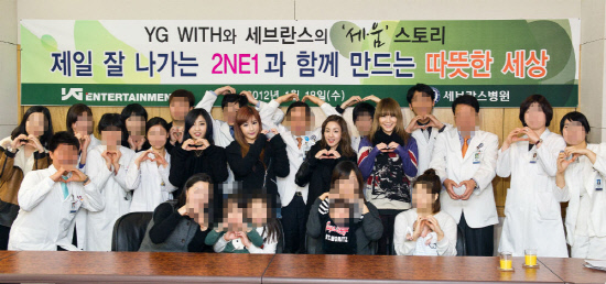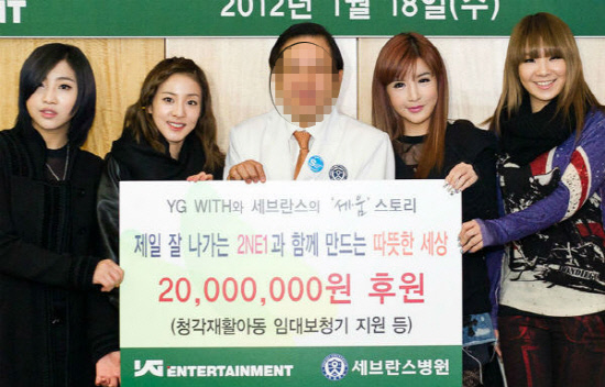 2NE1은 18일 연세대 세브란스 병원을 방문해 2000만원의 기부금을 전달했다. 소속사 YG엔터테인먼트는 2009년부터 'WITH' 캠페인을 실시, 수익 일부를 기부하는 공익 프로그램을 진행하고 있는데, 2011년 세브란스 병원과 협약을 맺은 뒤 처음으로 열리는 후원 활동에 2NE1이 함께한 것.