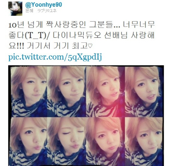 최근 레인보우 윤혜는 자신의 트위터에 "10년 넘게 짝사랑중인 그분들... 너무너무 좋다(T_T)/ 다이나믹듀오 선배님 사랑해요!!! 거기서거기 최고♡"라며 셀카 사진을 공개했다. 이에 다이나믹듀오 최자는 "호 호 혹시 레.. 레인보우? 오 위럽유투!!"라고 답했고, 개코 역시 "무지개가 떴다"고 화답했다. 리트윗을 받은 윤혜는 "크리스마스도 아닌데 너무 기쁘다"고 전해 주변을 훈훈하게 했다.