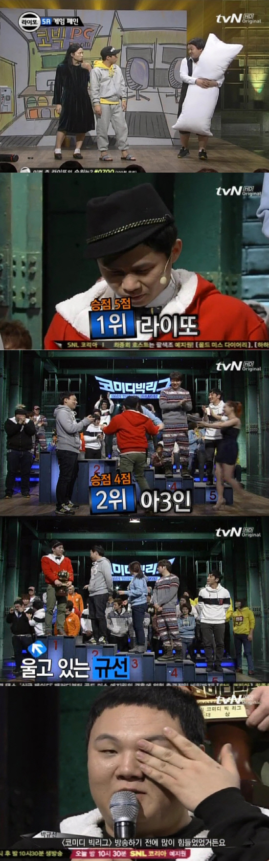 21일 방송된 '코미디 빅리그 시즌2(이하 코빅2)' 5라운드에서 라이또(양세형 이용진 박규선)는 온라인 게임 속 가상 세계와 현실을 구분하지 못하는 게임 폐인들의 이야기를 코믹하게 다루며 사상 처음으로 1위를 차지했다. 승점 1위를 달리고 있는 아3인을 누르고 1위의 영광을 안은 이들은 무릎을 꿇거나 눈물을 흘리는 모습이었다. 특히 지난 시즌에서 하위권에 그쳤던 양세형은 우승컵을 들어올리며 기쁨을 감추지 못했다. 또 이번 시즌에 새롭게 팀에 합류한 박규선은 "'코빅' 방송하기 전에 개인적으로 너무 힘들었다. 나는 더 이상 안 웃긴다는 생각에 힘들었는데 이 자리에 설 수 있어 기쁘다"며 눈물을 흘렸다.