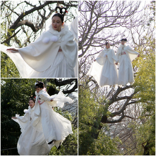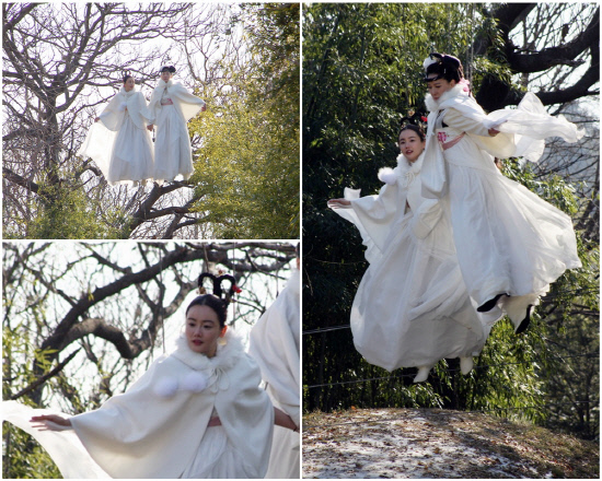 지난 10일 맹추위가 기승을 부리는 가운데 전북 남원에서 진행된 촬영에서 심혜진과 황우슬혜는 지상으로 강림하는 선녀모녀의 모습을 담아내기 위해 아찔한 높이의 와이어에 하루 종일 매달려 있었다.