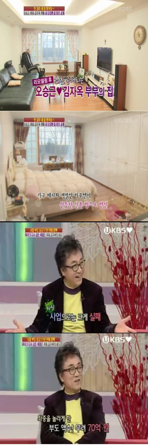 이어 "인테리어 하면서 둘이 싸우진 않았는냐"는 제작진의 질문에 오승근은 "김자옥이 나한테 다 맡겼다, 우린 싸우지 않는다"고 애정을 과시했다.
