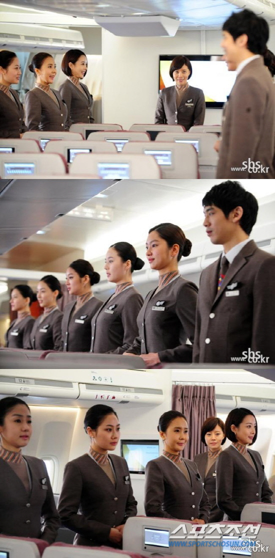 이날의 촬영은 이륙전 스마일 연습신. 주동민 PD의 큐사인에 이들은 얼굴에 한 껏 미소를 머금은 채 "개구리~ 뒷다리~"를 계속 연습했다. 승무원들이 승객들을 미소로 맞기 위해 항상 연습하는 단어다. 진지한 촬영이지만 서로 마주보며 "개구리~ 뒷다리~ 개구리~ 뒷다리~"를 계속 집중하다 배우들은 웃음을 못참고 그만 폭소를 떠뜨려 몇차례 NG가 나기도 했다.