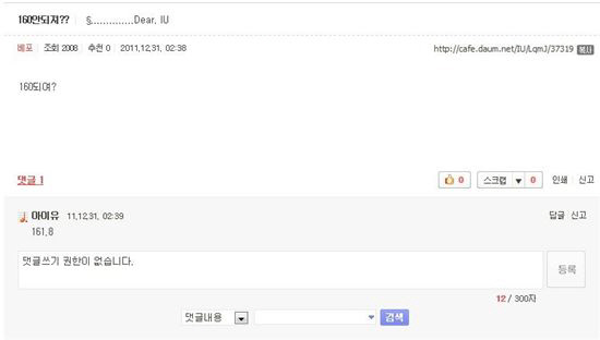 아이유 팬카페 '유애나'의 한 회원은 아이유에게 "키가 1m 60이 안되지 않느냐"고 질문했다. 이에 아이유는 "161.8"이라고 시크한 댓글을 달았다. 해당 게시물은 캡처본이 각종 온라인 커뮤니티를 중심으로 유포되며 인기를 끌고 있다. 네티즌들은 '아이유 너무 귀엽다' '초절정 시크녀' '소수점까지 챙기는 디테일'이라는 등 뜨거운 반응을 보이고 있다.