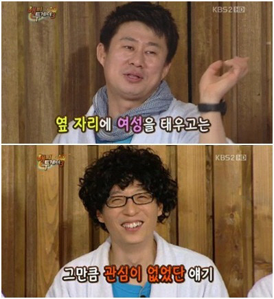 남희석은 "유재석이 처음으로 차를 사고 옆에 아름다운 여자를 태운 적이 있는데 유재석이 여자에게 매너 있게 집에 데려다주겠다고 했었다"고 전했다. 그런데 당시 유재석이 여자에게 멋있게 보이려고 한 손으로 핸들을 잡고 유턴을 하면서 핸들을 돌렸는데 처음이라 운전이 익숙하지 않아 그만 손이 미끄러진 것. 남희석은 "유재석의 미끄러진 손은 쾅 소리가 나도록 차창을 내리쳤고 이 때문에 본의 아니게 여자에게 화가 났다는 오해를 사고 말았다"고 말해 출연자들을 폭소케 했다.