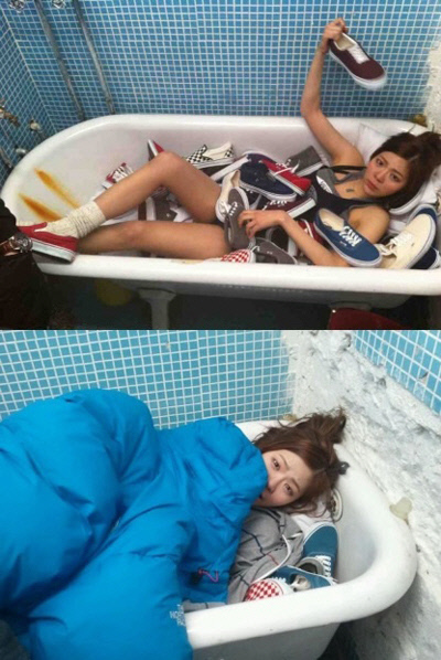 또 촬영 쉬는 시간에는 추위를 피하기 위해 두꺼운 점퍼를 덮고 눈만 빼꼼하게 내민 채 카메라를 응시하며 귀여운 매력을 발산했다.