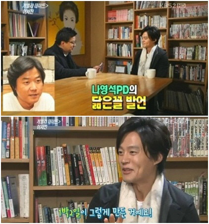 그는 "나는 평소 고생을 안 하다 그날 '1박2일' 녹화로 힘들어서 그렇게 된 것이고, 나영석 PD는 그동안 계속 고생을 하면서 그런 모습으로 변한 것"이라고 말해 폭소를 자아냈다.