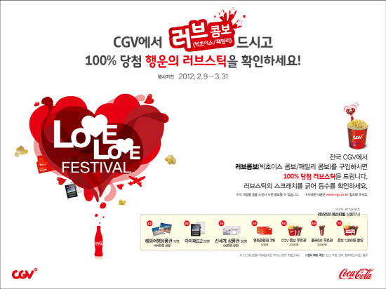 CGV는 전국 매점에서 발렌타인데이와 화이트데이를 맞이해 2월 9일부터 3월 31일까지 '러브 콤보'인 빅초이스콤보 또는 패밀리콤보 구매 시, 모든 고객에게 행운이 쏟아지는 '러브스틱'을 증정하는 '러브러브 페스티발'을 개최한다. CGV청담씨네시티에서는 모든 콤보를 구매 시 '러브스틱'을 증정한다. 이번 이벤트에선 400만원 상당의 여행상품권부터 아이패드2, 30만원 상당의 백화점 상품권, 영화관람권, CGV콤보와 콜라 무료권과 콤보 1000원 할일쿠폰까지 다양한 상품을 증정한다.