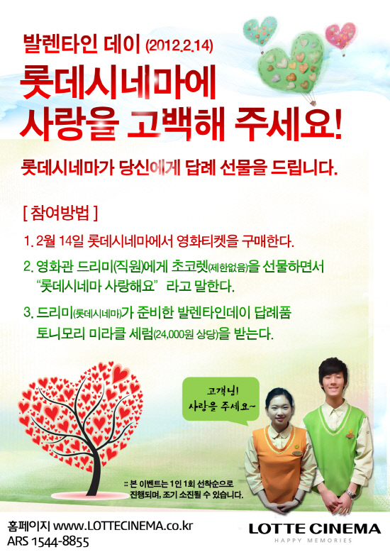 2월 14일 발렌타인 데이에 롯데시네마에서 영화티켓을 구매한 후 영화관 직원(또는 드리미)에게 초코렛을 선물하면, 답례품으로 '토니모리 미라클 세럼' 화장품을 증정한다.