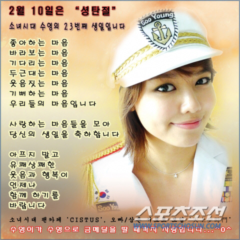 또 씨스터스는 스포츠조선에 광고를 게재, 수영의 생일을 대대적으로 축하하기도 했다. 이 광고에는 수영이 한 방송에서 "수영을 잘하는 같은 팀 멤버 유리가 부럽다"고 말한 것을 인용, '수영이가 수영으로 금메달을 딸 때까지 사랑합니다'라는 문구가 포함돼 있어 눈길을 끌었다.