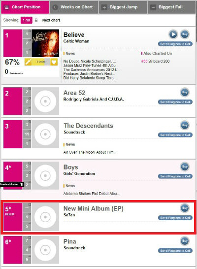 | align='left" bgcolor='#ffffff" class='caption'>세븐의 새 미니앨범이 미국 빌보드 월드차트 5위에 랭크됐다. |