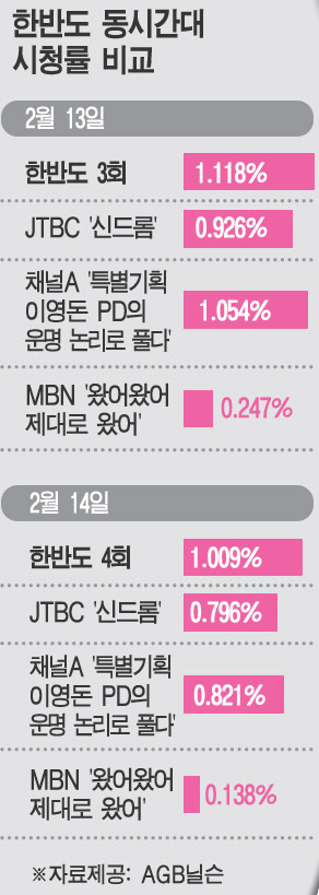 13일 1.118%, 14일 1.009%.(AGB닐슨미디어리서치) 이틀 연속으로 동시간대 종편 시청률 1위 자리를 지켰다. 시청자 게시판엔 긍정적인 의견이 잇달았다. 시청자 정상은씨는 "1회보다 나은 2회, 2회보다 나은 3회에 안심하고 기뻐하며 봤다. 드라마의 갈등과 배우들 감정에도 슬슬 몰입된다"고 의견을 나타냈다. 또 김은일씨는 "박진감 넘치고 재밌었다. 회가 더해 갈수록 '한반도' 폐인이 될 것 같다"고 밝혔다.