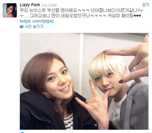 또 리지는 뉴이스트 멤버 렌과 함께 찍은 사진과 함께 "부산팸 렌, 넌 어쩜 나보다 예쁜 것 같니?"란 글을 공개해 관심을 끌었다.
