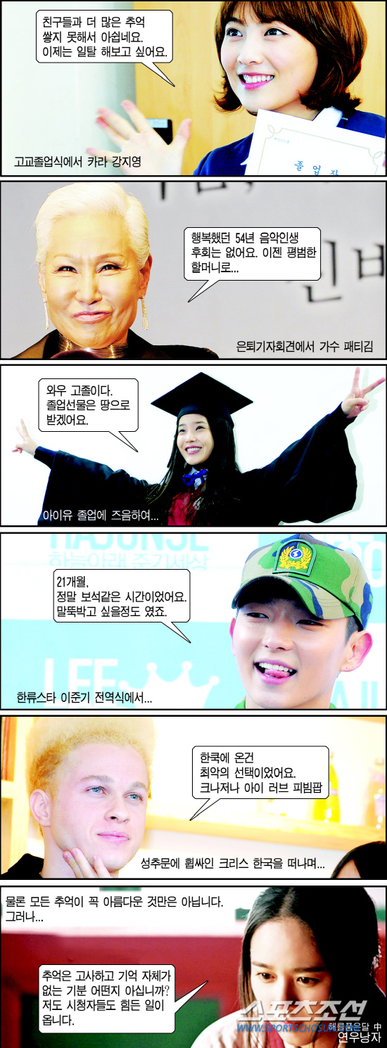 또다시 다가온 졸업의 계절, 고교를 마친 아이돌 스타들의 졸업식이 한창인 시기에 많은 선배 연예인들은 또 다른 의미의 졸업 시간을 가지며 소중한 추억을 되새겼다. 스무살의 성인가수가 된 아이유부터 스무살에 시작한 반세기 동안의 가수 생활을 마감한 패티김까지 소감은 모두 남달랐는데….