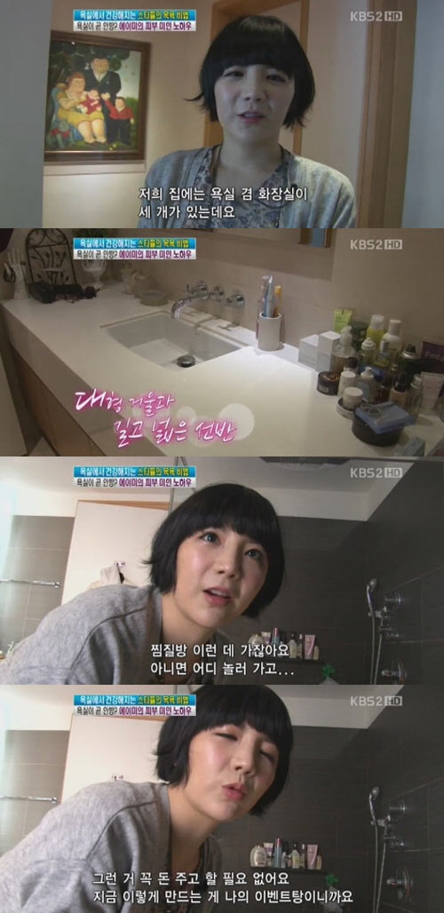 넓고 고급스러운 욕실에서 스트레스를 푼다는 에이미는 "돈 주고 다들 찜질방 어디 놀러 가는데 꼭 돈 주고 갈 필요 없다"며 "'녹차+미용 소금+우유'를 넣어 피부 미용을 위한 나만의 이벤트 탕을 만든다"고 자신만의 건강 유지법을 공개하기도 했다. <스포츠조선닷컴>