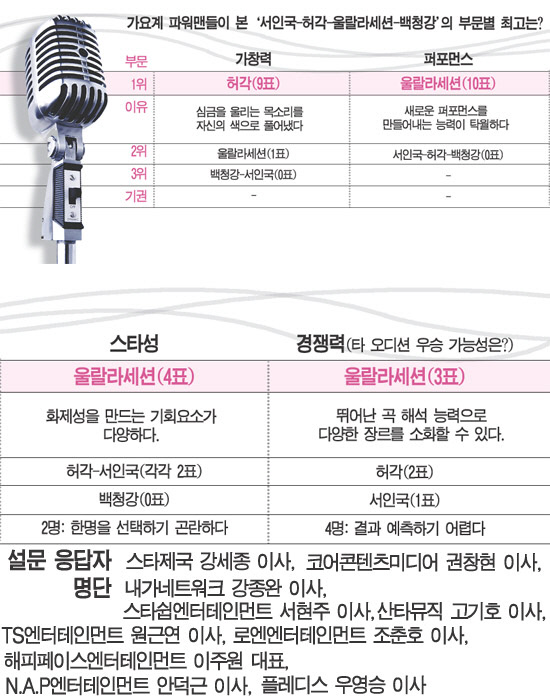 먼저 가창력 부문에서는 90% 관계자가 허각을 '최고'로 지목했다. "4명 모두 가창력은 좋지만, 허각은 심금을 울리는 목소리를 자신의 색으로 잘 풀어냈다"는 것이 중론이다. 울랄라세션(10%)은 2위를, 백청강과 서인국은 공동 3위를 차지했다.