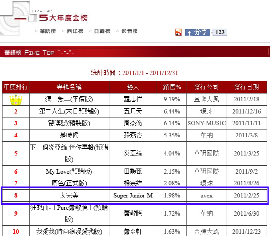 슈퍼주니어의 중국권 유닛 그룹인 슈퍼주니어-M은 대만 최대 음악사이트 중 하나인 파이브 뮤직에서 집계한 '2011년 대만 총 음반 판매량' 순위에서 '태완미'로 8위를 차지했다.