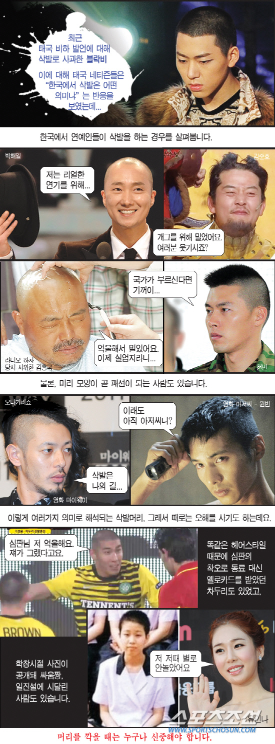 태국홍수와 관련한 무개념 발언으로 구설수에 오른 힙합그룹 블락비가 삭발로 사과의 뜻을 전했습니다. 이에 태국 네티즌들은 "한국에서 삭발의 의미는 무엇이냐? 태국에서는 그냥 패션일 뿐이다"는 반응을 보이기도 했습니다. 한국에서 머리를 짧게 깎는다는 것은 시기와 장소에 따라 여러가지 의미로 해석되곤 합니다. 그렇다면 스타들은 어떨 때 삭발을 할까요?