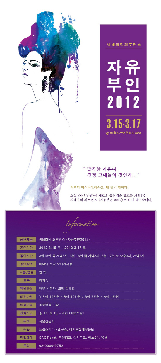 15일부터 17일까지 예술의전당 오페라극장에서 공연되는 씨네마틱퍼포먼스 '자유부인 2012'. 1954년 발표돼 엄청난 사회적 파장을 몰고왔던 정비석의 소설 '자유부인'이 현재적 시점에서 새옷을 입고 태어난다.