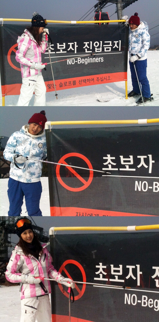 실제로 스키 초보자인 두 사람은 크게 적힌 초보자 진입 금지 현수막을 스키 폴대로 가리키며 설정샷을 찍어, 보는 이들로 하여금 웃음을 자아내게 한다.