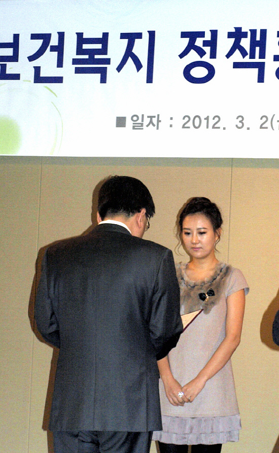 장윤정은 2일 서울 63빌딩 로즈마리 홀에서 열린 '보건복지정책홍보 유공자 시상식'에서 2011년 한해동안 우리 사회를 따뜻하고 아름답게 만들어가기 위해 노력한 공을 인정받아 수상의 영광을 안았다.