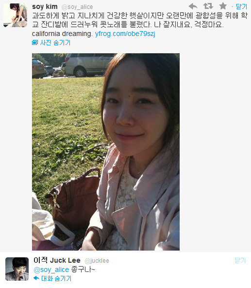 걸그룹 티티마 출신의 가수 소이가 봄날 미국 캠퍼스에서 찍은 신입생 포스의 셀카를 공개했다.