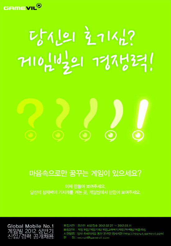 '프로야구' 시리즈, '제노니아' 시리즈, '에어펭귄' 등 히트작을 만든 모바일게임사 게임빌이 2012년 상반기 공개 채용을 실시한다.