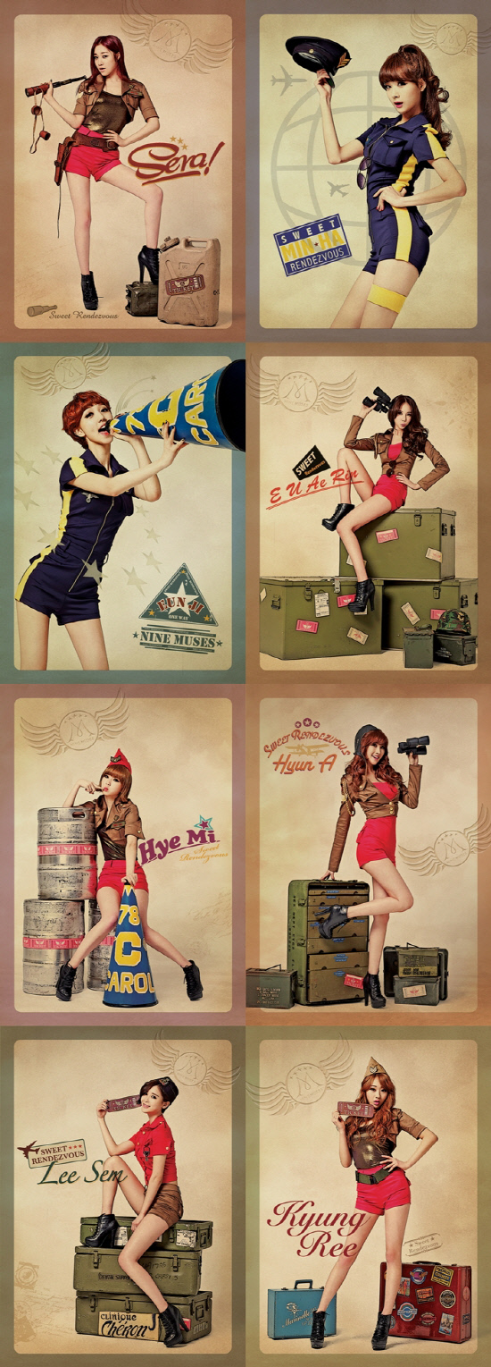 빈티지 기차 컨셉트 화보 공개로 화제를 모았던 나인뮤지스는 7일 첫 미니 앨범 '스윗 랑데뷰' 2차 재킷 이미지를 공개했다. 이번에 공개된 사진에서 이들은 티켓이란 주제와 레트로 빈티지 컨셉트를 절묘하게 조화시킨 룩을 선보였다. 특히 스포티하면서도 발랄한 느낌의 의상을 재해석, 섹시미와 여성스러운 매력을 동시에 선보인 모습은 1940년대 유행했던 핀업걸 포스터를 연상시킨다는 평.