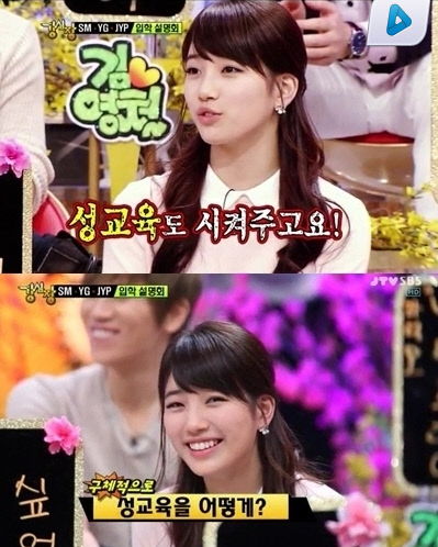 수지는 6일 방송된 SBS '강심장'에 출연해 JYP의 장점을 설명하던 중 "JYP는 교육을 잘 해준다. 춤, 노래는 기본이고 성교육도 시켜준다"고 폭탄발언을 했다.