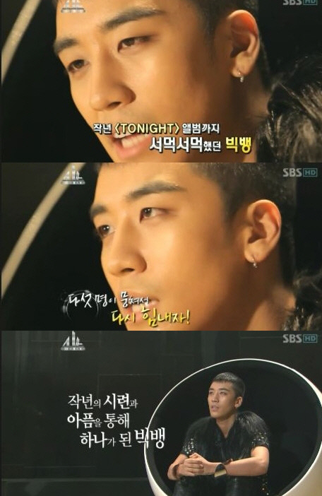 9일 방송된 SBS '빅뱅 컴백쇼-얼라이브 빅뱅'에서 승리는 "사실 지난해 '투나잇' 활동 때까지 멤버들간 사이가 좋지 않았다. 서먹서먹했다는 것이 더 맞는 말일 것 같다"며 "멤버 모두 개인 활동에 대한 욕심이 있었다. 나 혼자 나와도 잘될거라 생각했다. 태양과 나는 솔로 앨범에 욕심을 냈고, 탑은 영화나 드라마에 욕심이 있었다. 지드래곤은 프로듀서로서의 꿈이 컸다"고 밝혔다.