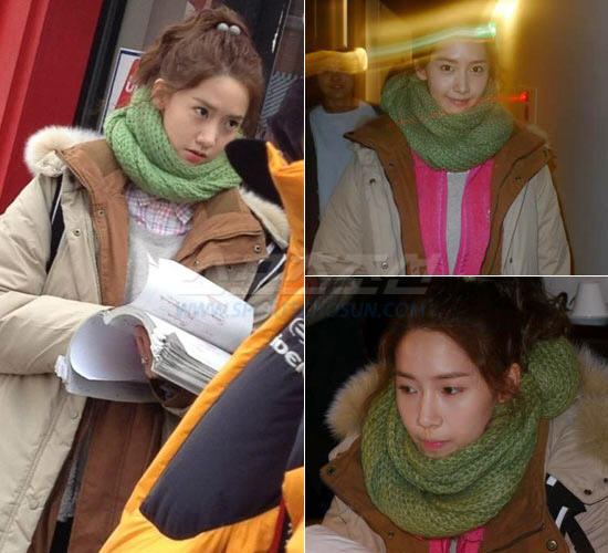 공개된 사진에는 KBS2 드라마 '사랑비' 촬영 중인 윤아의 모습이 담겨 있다. 윤아는 두툼한 점퍼에 여러 겹의 옷을 껴입고 커다란 녹색 목도리를 두른 채 촬영에 임하고 있다.