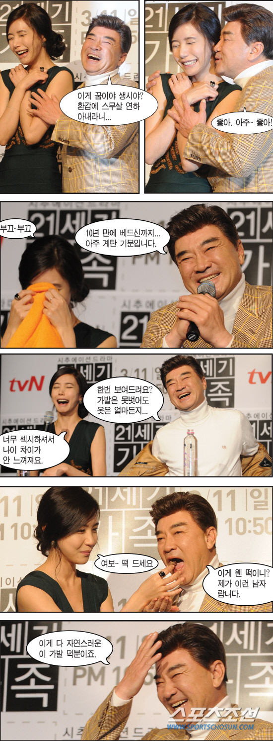 환갑을 맞은 탤런트 이덕화의 입이 귀에 걸렸다. 극중에서 스무살 차이가 나는 오승현을 아내로 맞은 데다 주인공 자리까지 꿰찬 것이다. 이덕화는 지난 6일 있었던 tvN 드라마 '21세기 가족' 제작발표회에서 극중 아내인 오승현에게 과감한 스킨십을 선보이며 회춘한 기분을 만끽했다. 그는 "모든 것이 이 가발 덕분"이라며 말끝마다 가발예찬론도 아끼지 않아 행사장을 폭소의 도가니로 만들었다.